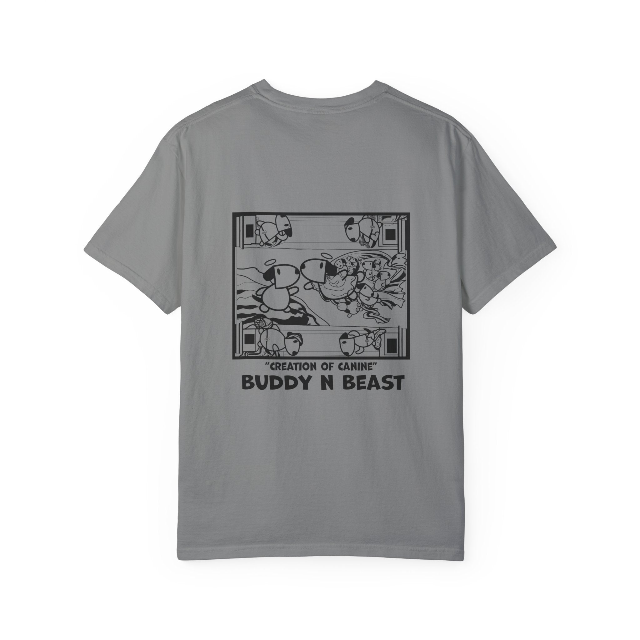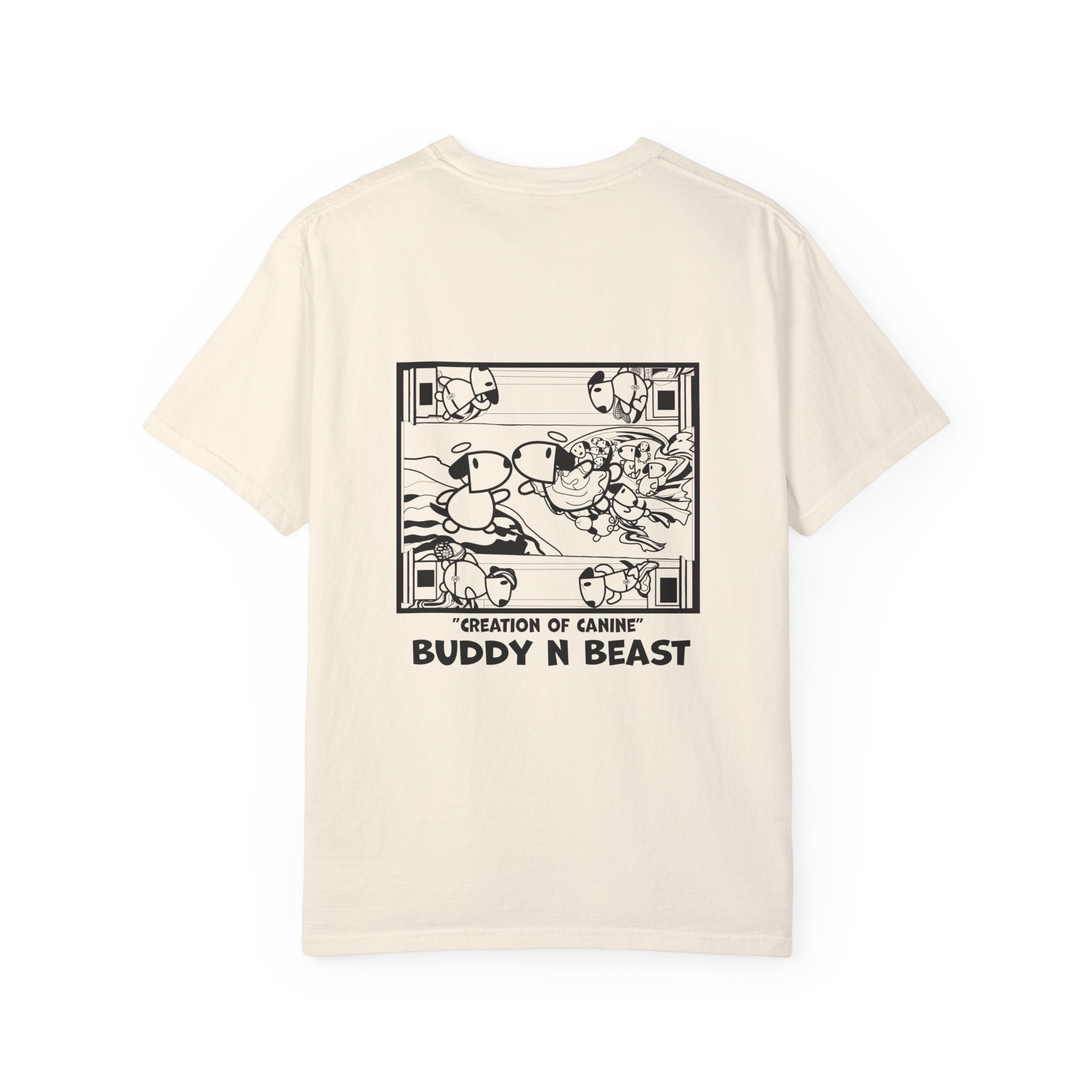 The Creation of Canine shirt is a thoughtful and artistic tribute to the timeless bond between humans and dogs. Inspired by Michelangelo’s Creation of Adam, this design reimagines the iconic moment with our brand mascots — Buddy and Beast — reaching out to one another across a celestial backdrop, symbolizing loyalty, love, and the spark of companionship that defines every dog-human relationship.