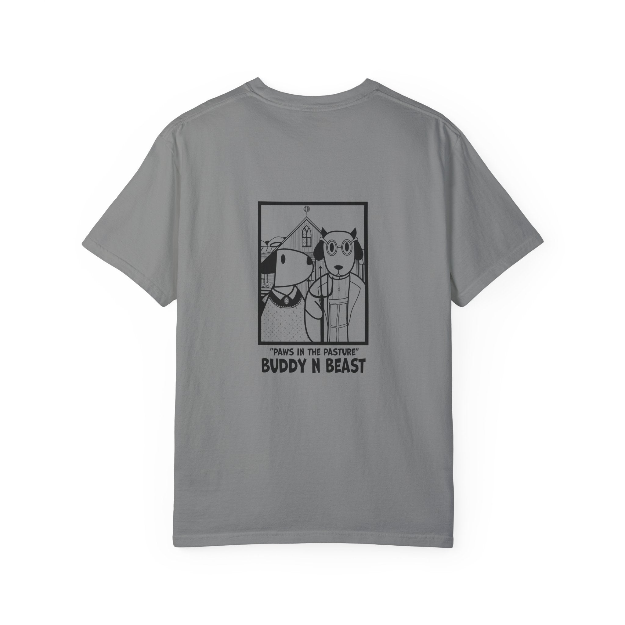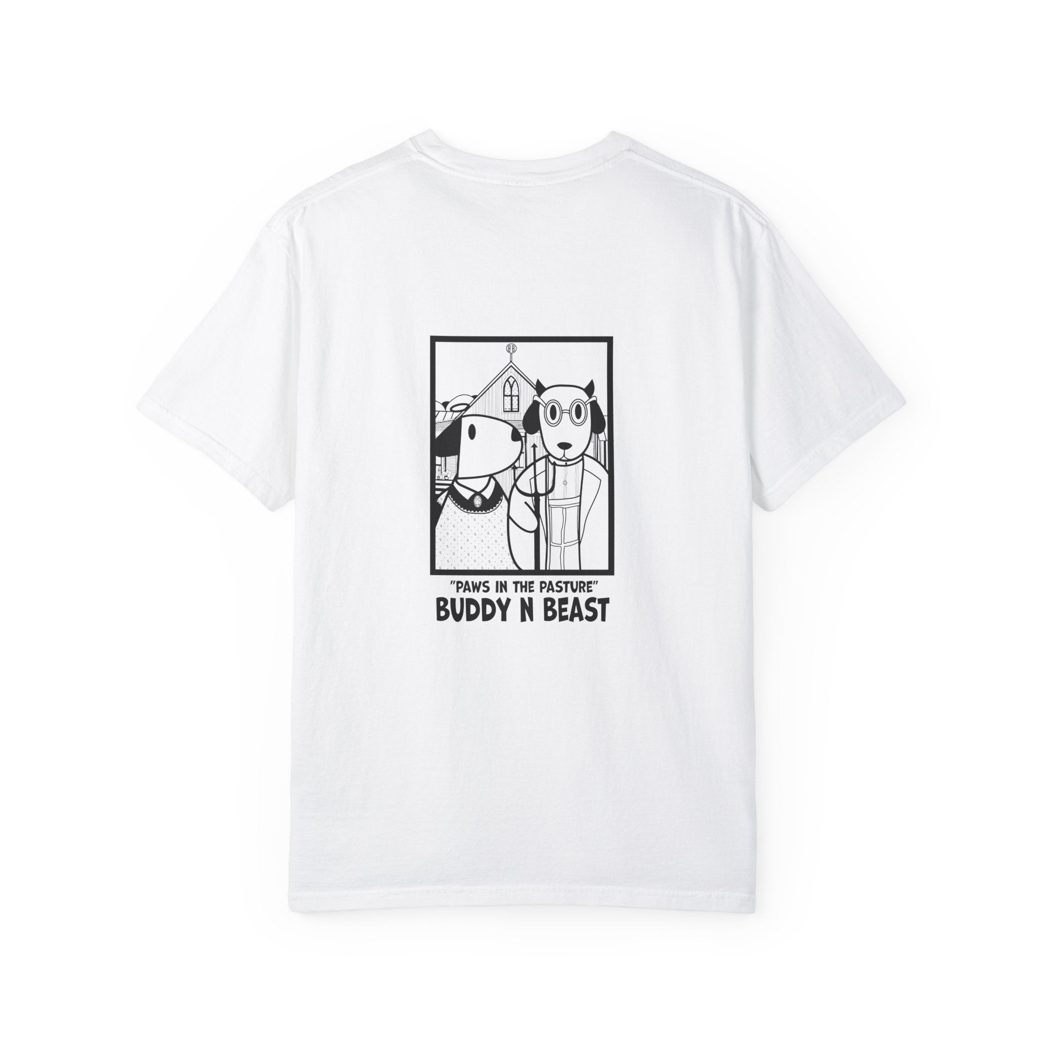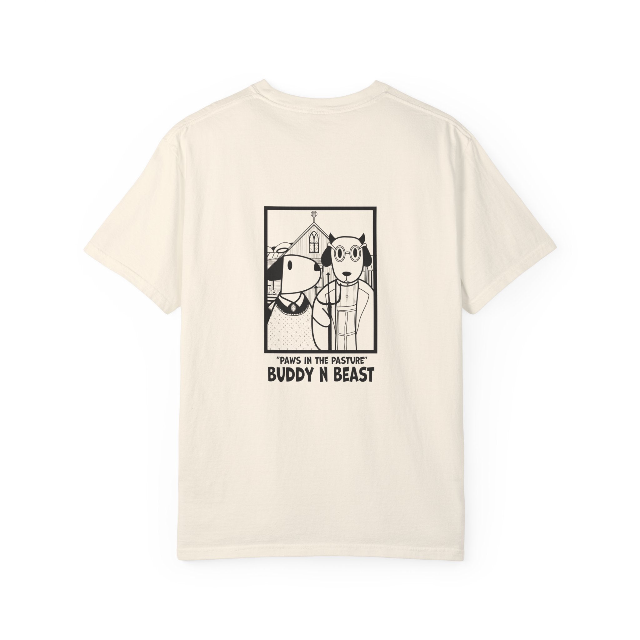 Paws in the Pasture is a whimsical reinterpretation of Grant Wood’s iconic painting American Gothic, brought to life through the unique lens of Buddy N Beast. In this limited edition design, our beloved characters — Buddy and Beast — take the place of the stoic farmer and his daughter, standing proudly in front of a weathered farmhouse with pitchfork in paw. This artwork playfully honors the rural roots and loyal spirit of dogs, blending Americana with canine charm.